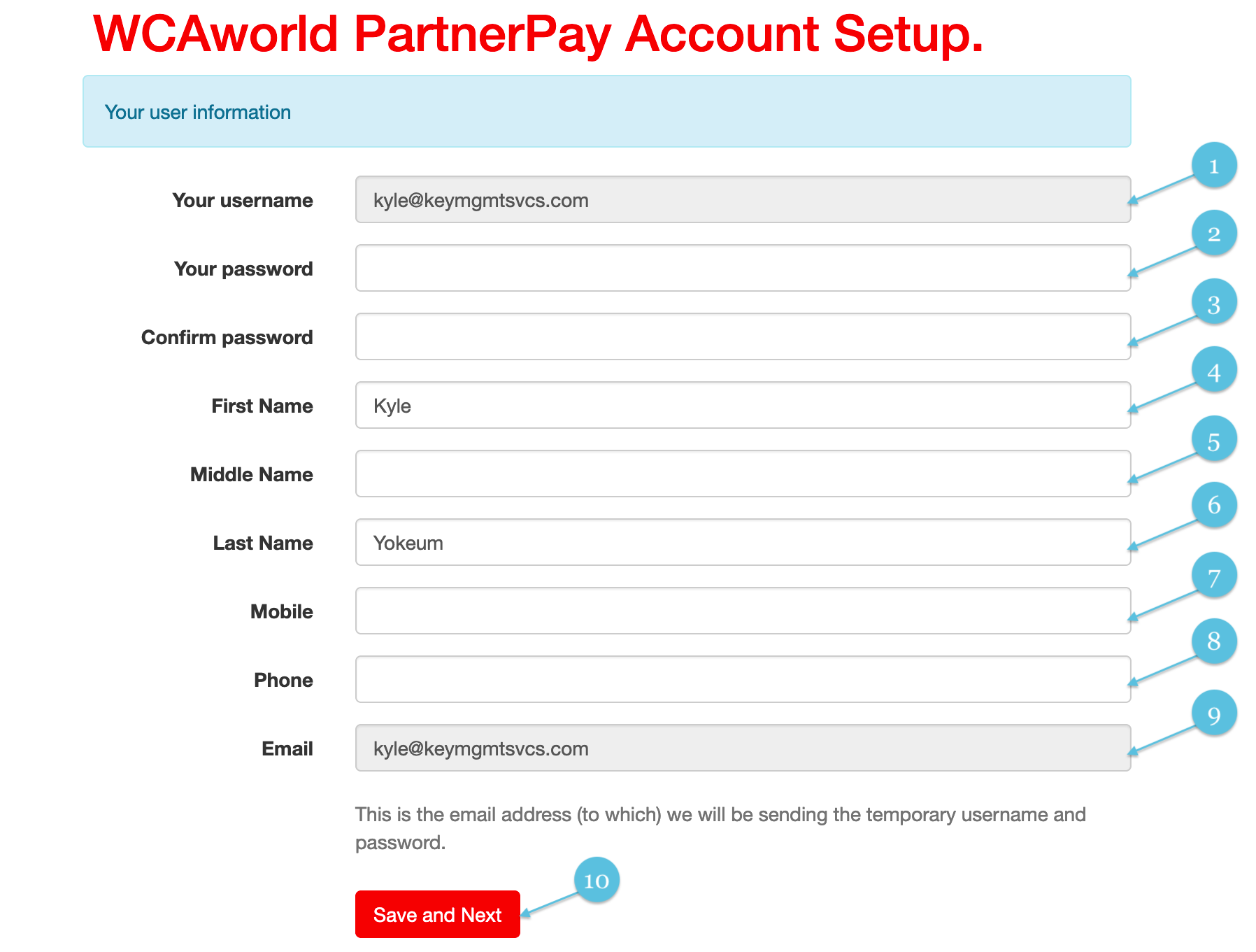 The first time you sign into WCAworld PartnerPay a screen will display requesting you to change your password from the one you were temporarily assigned.